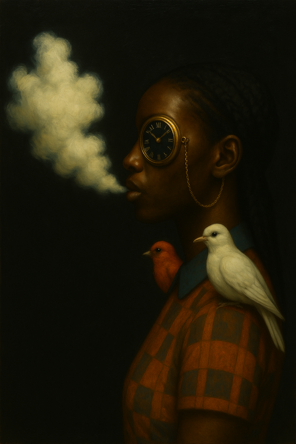 This series explores the architecture of inner landscapes — mapping the spaces between memory, vision, and the unseen. Recurring motifs—clocks, birds, clouds of smoke, and thread—serve as portals, each holding symbolic weight in the mythos she’s shaping. The clouds appear throughout her work as a liminal veil — a passage between the dreamworld and walking life — echoing Neptune’s nebulous realm. These are not merely paintings; they are visual records of memory in motion. The figures she depict are not fantasies. They are archetypes drawn from lived experience, spirit encounters, and imagined futures. she paints to preserve what the rational world often forgets.